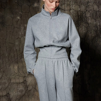 शरद ऋतु का नया स्पोर्ट्सअप कॉलर जिप-अप कॉलर जिप-अप जैकेट और कमर-सिचिंग डिजाइन के साथ दो-टुकड़ा सेट सेट